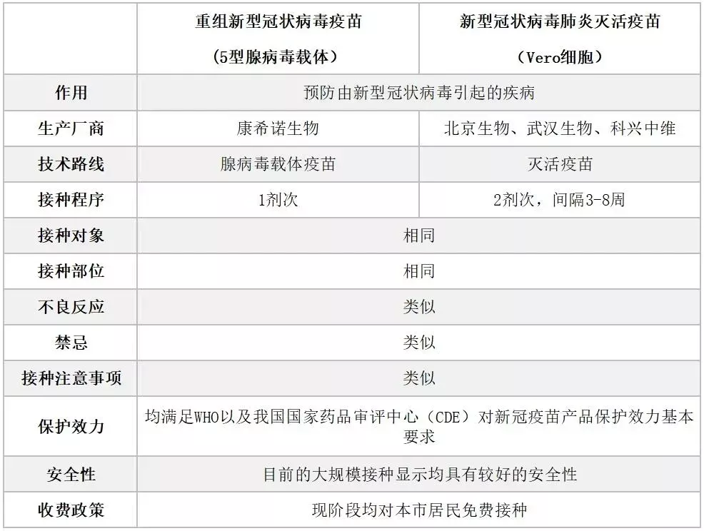 上海市疾控中心方面透露,与之前上海使用的三种新冠病毒灭活疫苗相比,这款由康希诺生产的腺病毒载体疫苗在技术原理、接种程序方面完全不同,但在接种方式、接种年龄范围、安全性方面都相同。