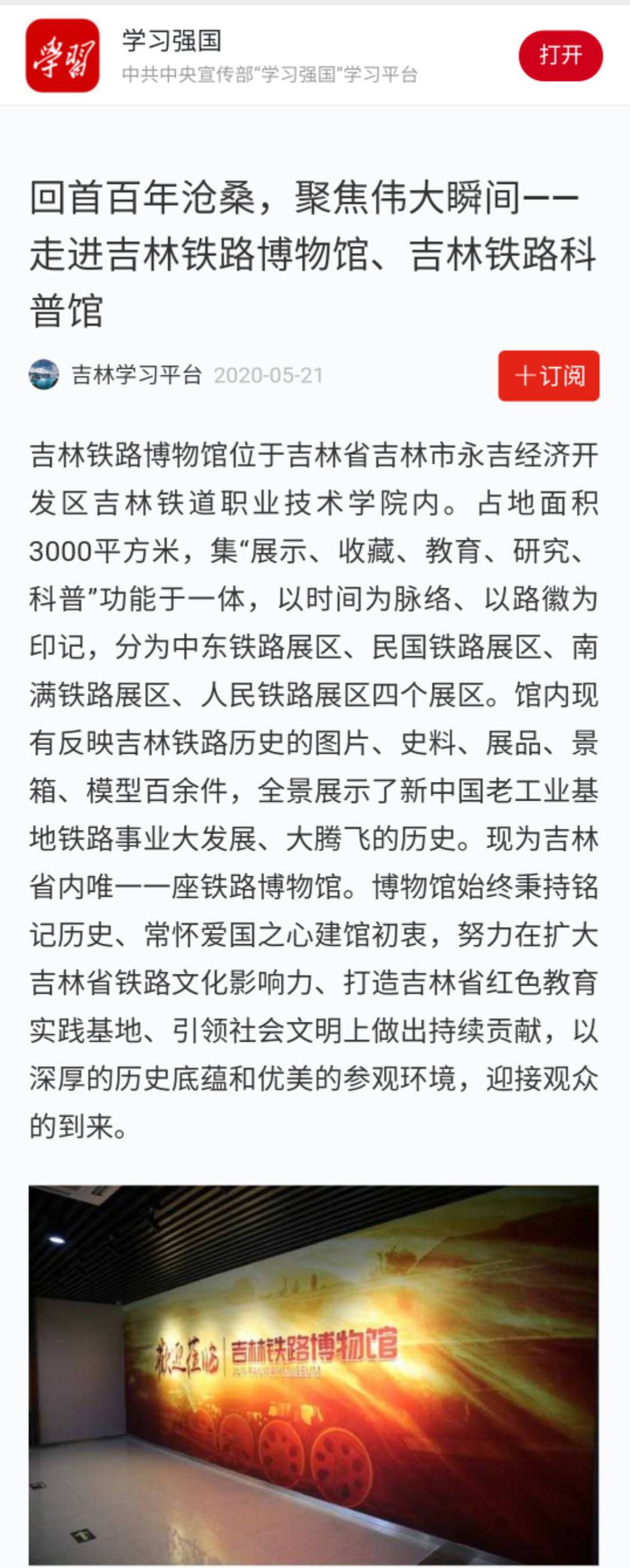 5月21日,《学习强国》学习平台、《吉报教育》等10余家媒体以“回首百年沧桑,聚焦伟大瞬间——走进吉林铁路博物馆、吉林铁路科普馆”为题,对我校吉林铁路博物馆、吉林铁路科普馆进行了宣传介绍。