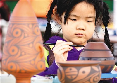 图为一名小朋友在遗址公园考古体验园绘制纹饰。新华社记者李 安摄